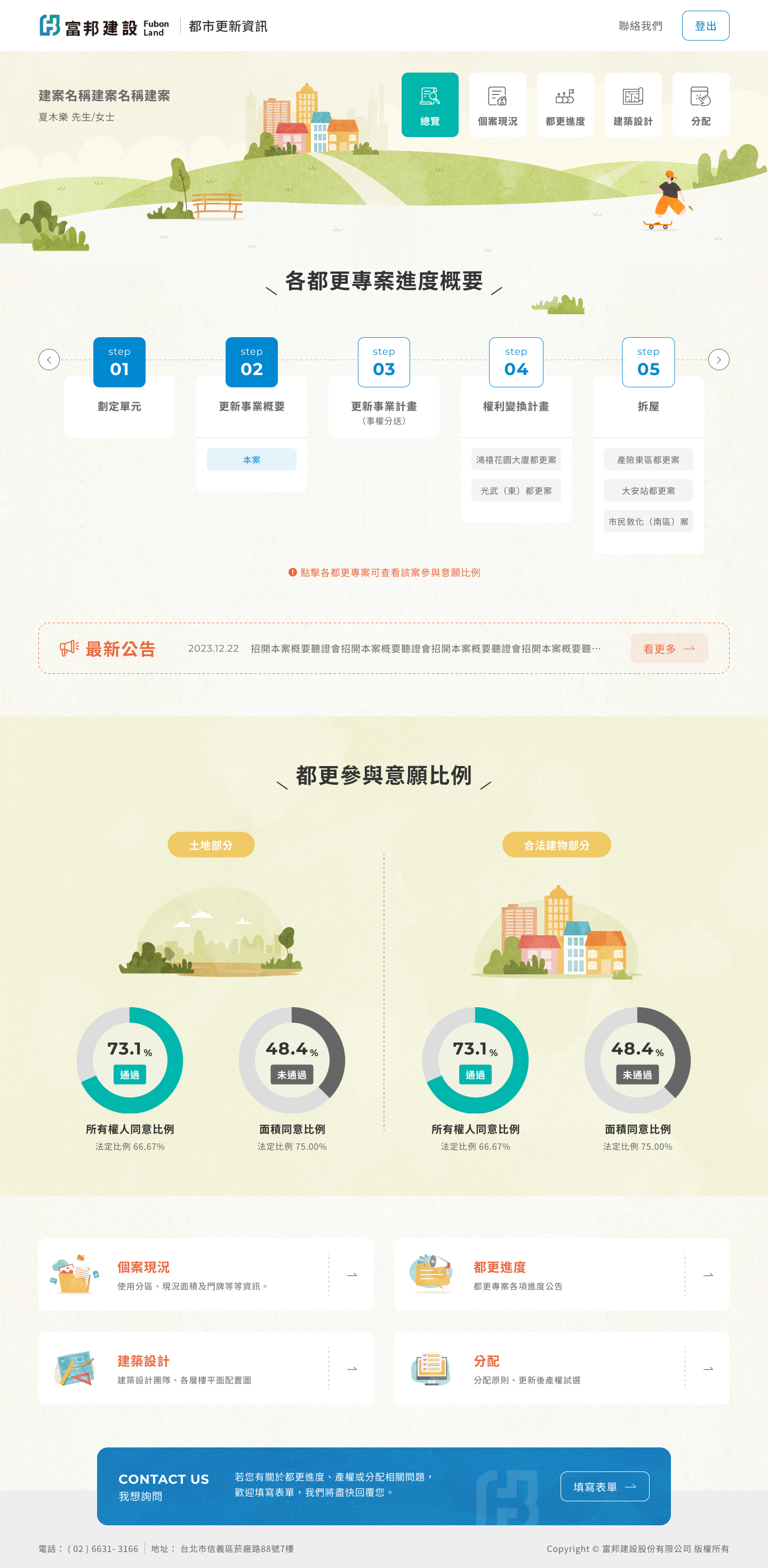 富邦建設都市更新專屬平台,提供執行中都更案所有權人查詢個案現況、都更進度等,瀏覽建築設計,了解選屋流程,協助您安心參與都市更新
