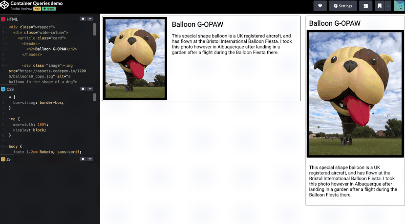 例如,我們設計一張「個人資料卡片」時,可以依據卡片容器的寬度來調整其排版,當寬度較窄時,圖片和文字堆疊;當寬度足夠時,內容則呈現左右分佈。
