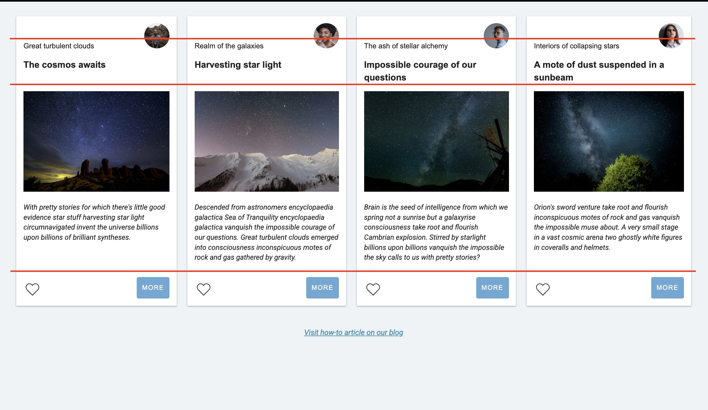 過去,我們透過 CSS 網格布局來輕鬆創建複雜的網頁結構。但在子元素排版時,如果要對齊方格中的子元素,就要額外用類似 flex + height + margin: auto 的方式讓卡片對齊高度。而次網格特性讓子元素可以直接繼承父網格的行列分佈,減少不必要的重複設置。