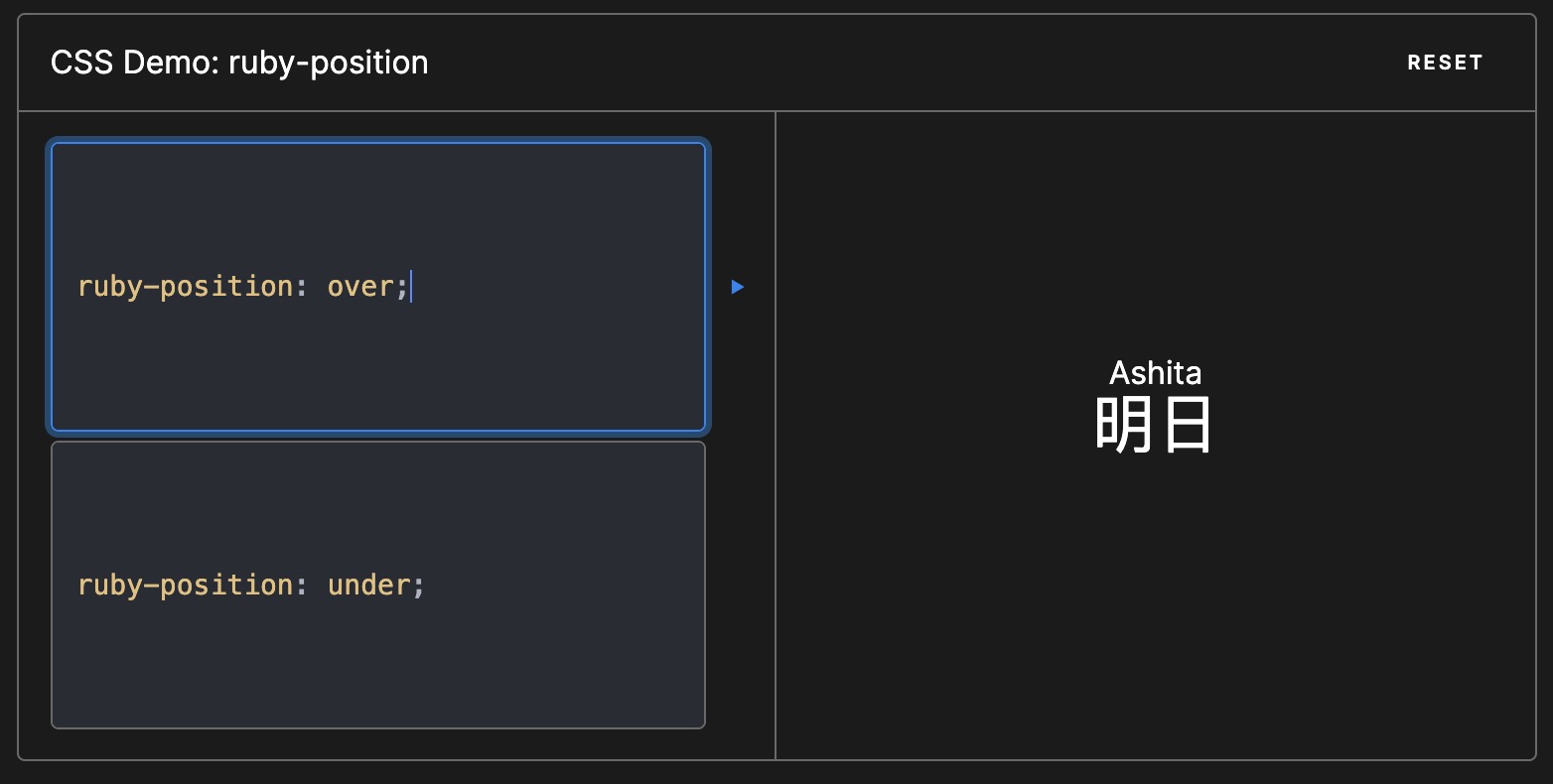 為了更好地呈現語言學習中的注音文本,CSS 現在支持 Ruby 佈局,用於不同語系中標記輔助發音資訊。Ruby 是一種用於亞洲語言(如日文、中文)中的特殊排版技術,通常將註解部分放置於主文上方或下方,這對於語言學習和語言無障礙設計尤為有幫助。